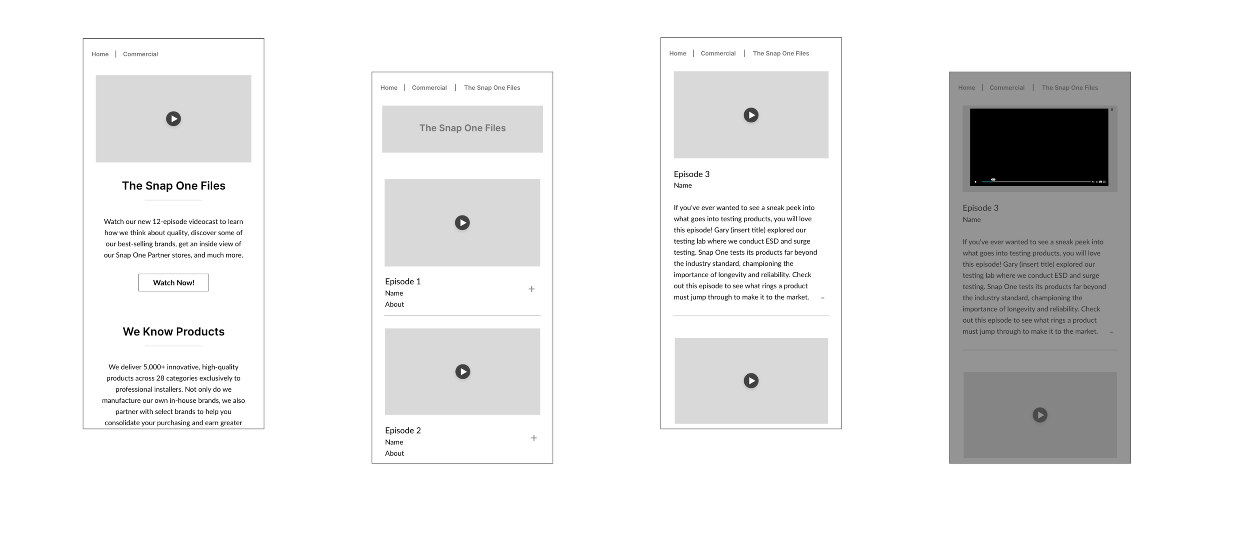 Stakeholders needed a comprehensive way to deliver videos created in collaboration with rAVe [PUBS]. This landing page needed to keep partners and prospects on the website and drive them to purchase the associated products by showcasing these products in the imagery. Additionally, the thumbnail images provided by rAVe [PUBS] needed revamped in order to align with Snap One’s brand. How can we create a video library on snapav.com that is easy to use?