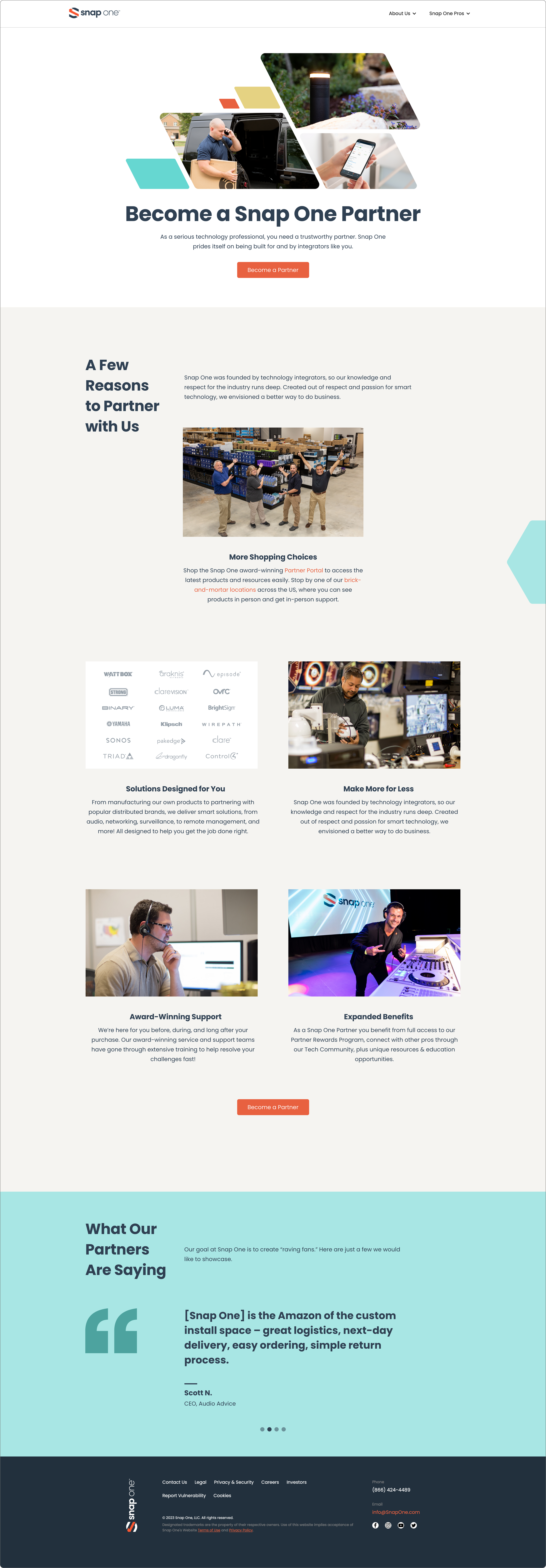 First impressions are everything when trying to grow your business and acquire partners. With user’s first interactions on the website, potential partners decided to either sign up or not. By creating one page with all the key information about signing up and one clear CTA, it was easier for partners to make the choice to join Snap One.